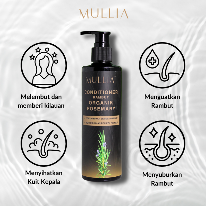 Conditioner Rambut Organik Rosemary adalah penting untuk lengkapkan rutin penjagaan rambut selepas syampu. Codtioner atau perapi rambut Mullia ini diperkaya dengan minyak pati rosemary organik dan bahan semulajadi seperti hibiscus, aloe vera, dan lavender. Diformulasikam untuk melembapkan rambut, menjadikan rambut lembut, licin, dan bersinar. Selain itu, perapi membaiki dan melindungi rambut dari kerosakan.