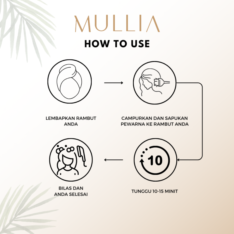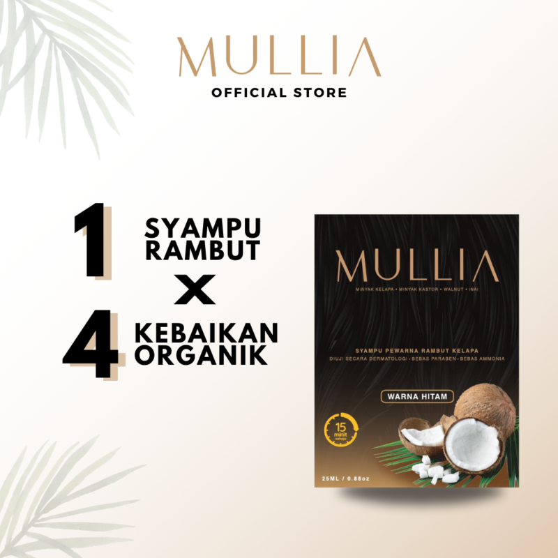 Syampu Pewarna Rambut Mullia – Syampu 2 dalam 1 bersama pewarna rambut yang diformulasikan dari bahan-bahan organik. Kandungan penting Syampu Pewarna Mullia seperti minyak kastor, ekstrak walnut, dan ekstrak daun henna memainkan peranan penting menjaga kesihatan serta kecantikan rambut anda.