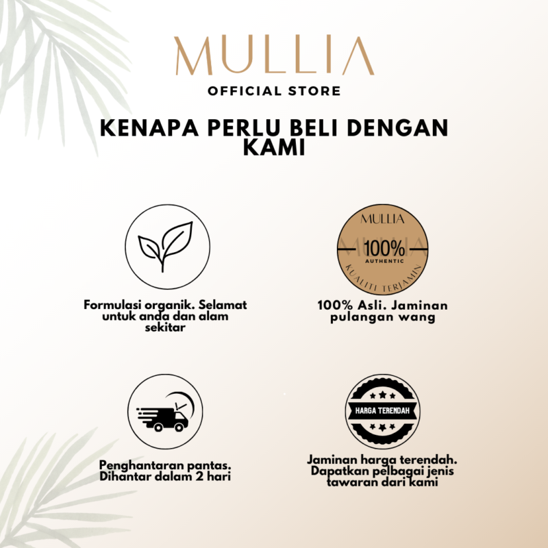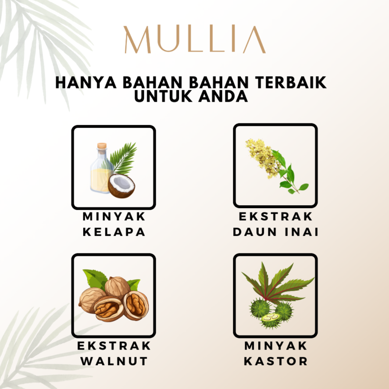 Bahan Semulajadi: Syampu Pewarna rambut Mullia dihasilkan dengan menekankan keaslian bahan campuran, formula syampu ini mengandungi bahan asli minyak kastor, ekstrak walnut, dan ekstrak daun henna. Bahan-bahan semulajadi ini memberikan hasil warna yang menarik selain menjaga kesihatan dan kecantikan rambut.