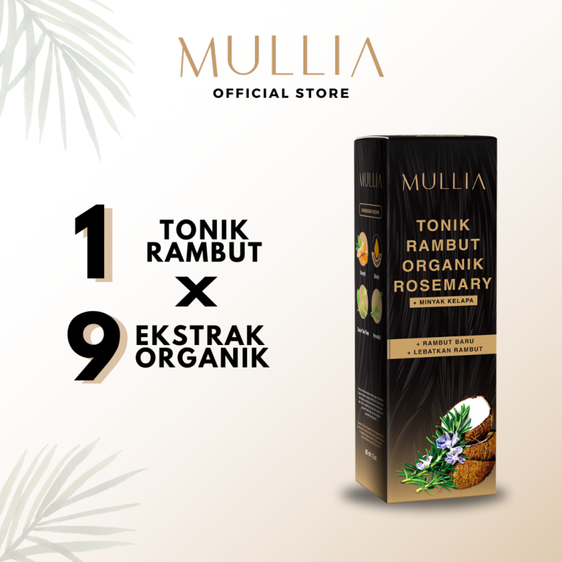 Tonik rambut Mullia diformulasikan dengan bahan organik semulajadi sepenuhnya. Fungsi Tonik rambut adalah untuk menyuburkan serta menyegarkan kulit kepala dan rambut. Esen Rosemary dan minyak kelapa adalah kandungan penting dalam Tonik rambut Mullia bersama ginseng, ekstrak walnut, peppermint, kunyit, biotin, daun pokok tea tree, dan horsetail.