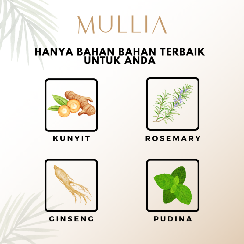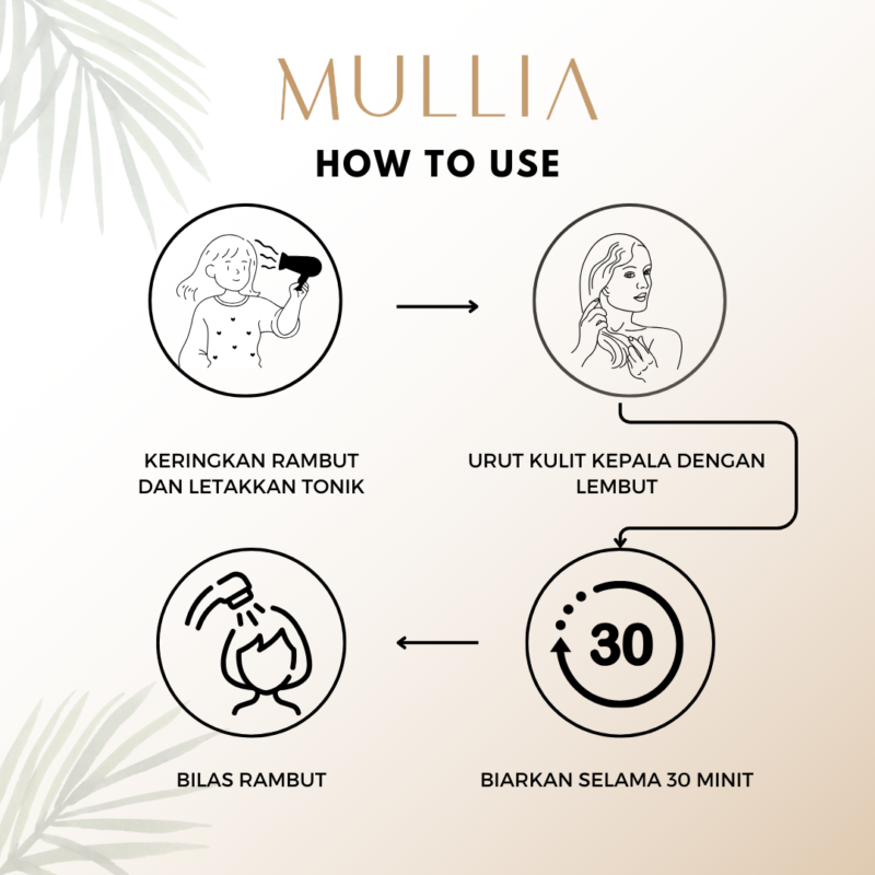 Meningkatkan Pertumbuhan Rambut: Tonik rambut Mullia diperkaya dengan bahan organik yang bertindak menguatkan rambut, meransang bertumbuhan rambut baru dan menjadikan rambut lebih tebal.