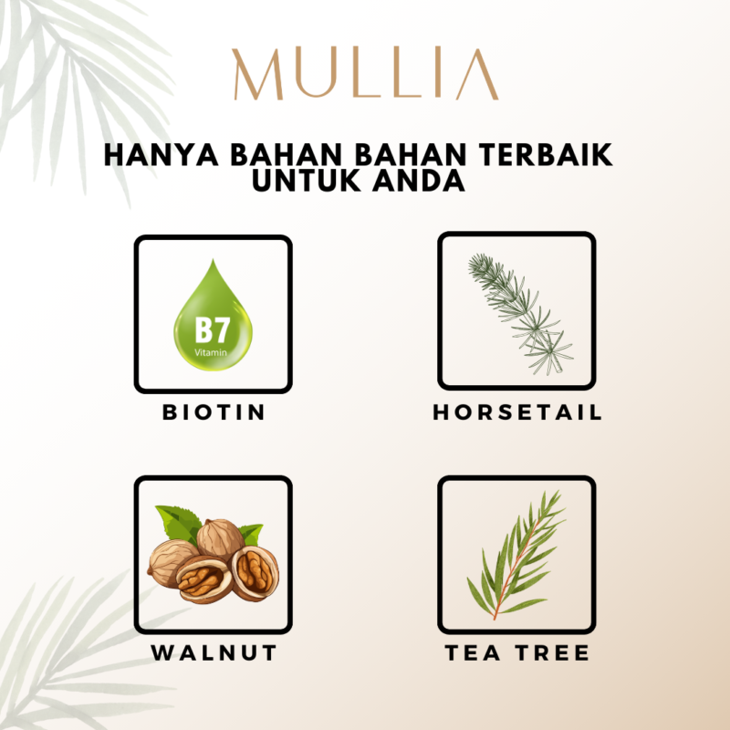 Mullia menjamin keyakinan rutin penjagaan rambut anda dengan bahan organik semulajadi yang bukan sahaja menyuburkan rambut anda tetapi juga meningkatkan kesihatan kulit kepala. Rasai perbezaan dengan formula bebas paraben dan bebas bau kami yang menyumbang kepada pertumbuhan rambut baru dan kelebatan. Serlahkan kecantikan anda dari hujung rambut dengan Mullia.