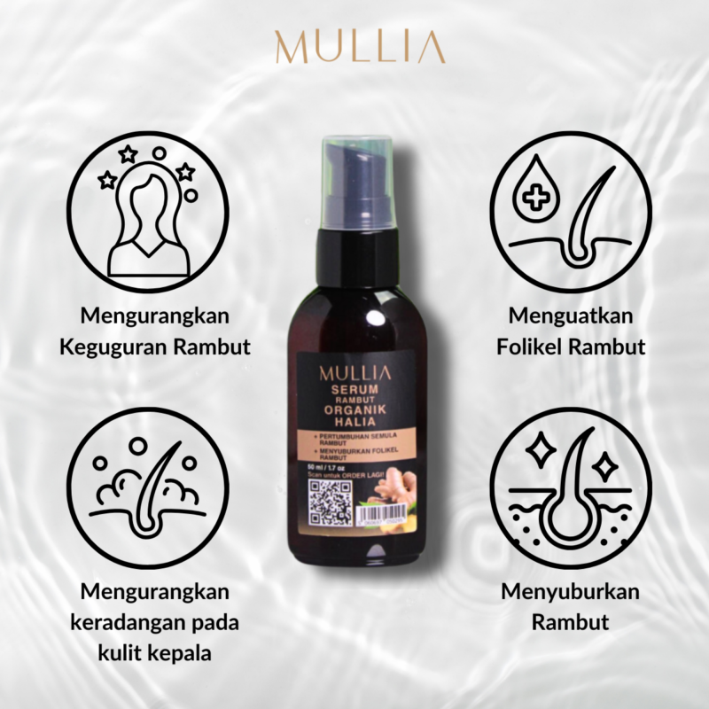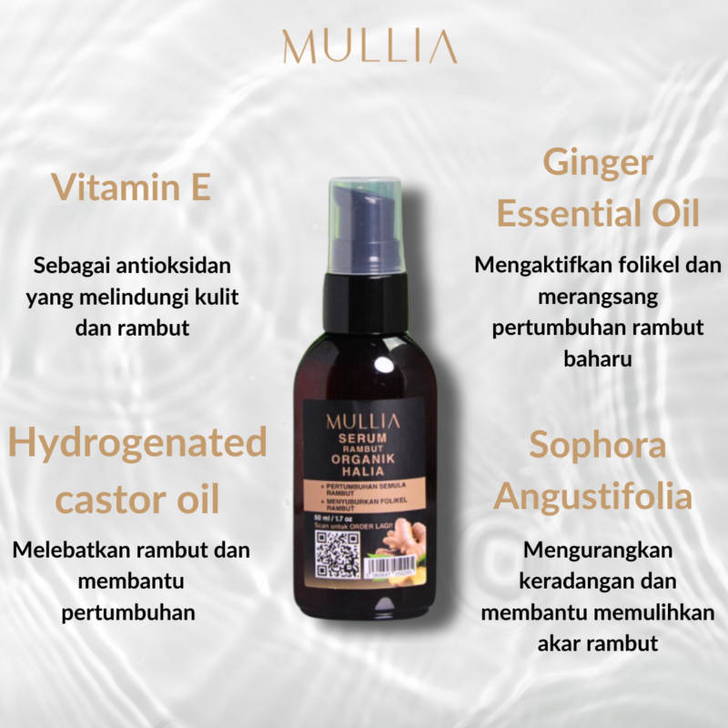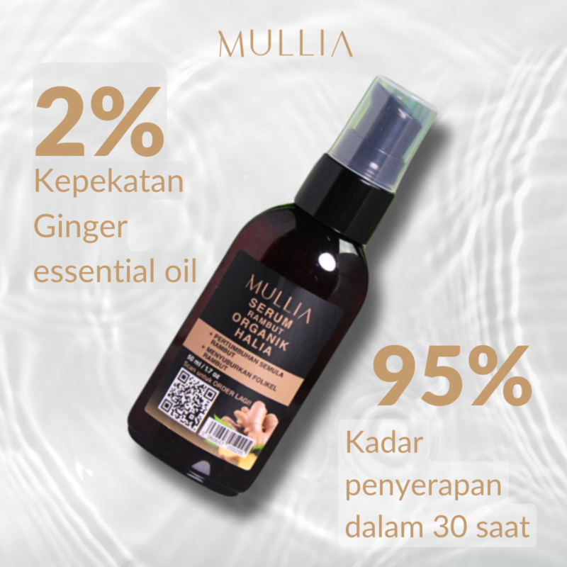 • Mullia Organic Ginger Intense Hair Activation & Growth Serum: Menembusi secara mendalam untuk mengaktifkan folikel rambut dan menggalakkan pertumbuhan rambut.